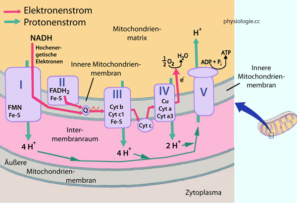 der inneren Mitochondrienmembran übertragen, diese sezerniert H+ in den Intermembranraum. Der so entstandene Protonengradient treibt ATP-Synthasen an, durch die H+ in das Mitochondrium zurückdiffundieren und dabei den Aufbau von ATP antreiben (rückwärtslaufende H+-ATPase, chemiosmotische Koppelung). Die