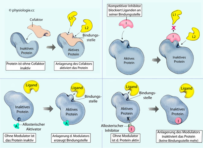 Rezeptors oder Enzyms bewirkt. Eine solche Bindungsstelle heißt allosterische / regulatorische Stelle, der Effektorstoff wird - je nach Wirkung - als allosterischer Aktivator bzw. allosterischer Inhibitor bezeichnet.