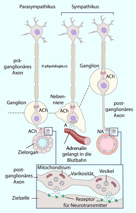 den Ganglien erfolgt die Verrechnung zahlreicher Eingänge; postganglionäre Neuronen verteilen entsprechende Impulse auf die Peripherie. Varikositäten sezernieren via Ca++-Ionen, VAMPs und SNAPs den jeweiligen Transmitter zusammen mit Kotransmittern