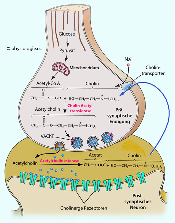 vesikulär gespeichert wird. Vesikuläre Acetylcholintransporter (VAChT) lagern pro cholinergem Vesikel 104 Acetylcholinmoleküle ein. Die neuronale Aufnahme von Cholin aus der extrazellulären Flüssigkeit ist der geschwindigkeitsbestimmende Schritt der Transmittersynthese.