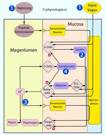 Phase. Dazu kommen lokale Reflexe des enterischen Nervensystems. Zusammen ergibt das u.a. die volle Magensaftproduktion. G-Zellen werden chemosensitiv