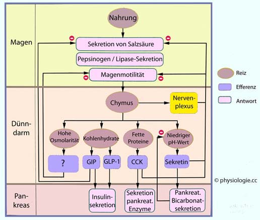 Abbildung) wird vom oberen Dünndarm beigesteuert: Sie beginnt, sobald der Chymus in diese Zone eintritt. Zellen in den Darmkrypten, dem Pankreas und den Gallengängen werden von dieser Phase beeinflusst:
