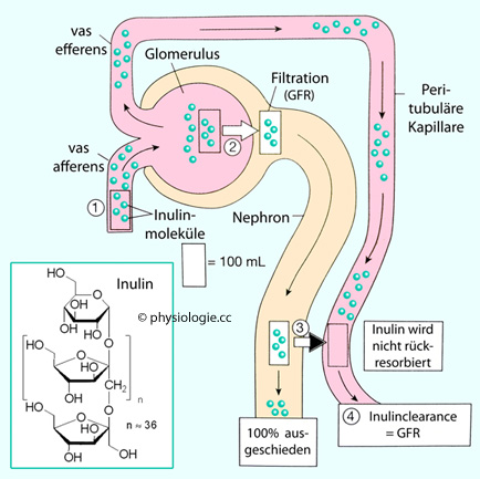 Inulin dient als Marker für die glomeruläre Filtration, seine fraktionelle Ausscheidung beträgt 100%.
