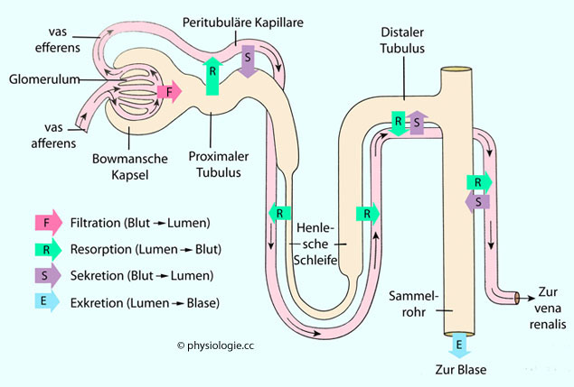 . Letzterer verändert das im Glomerulus entstandene Filtrat, indem er Stoffe in (peritubuläre) Kapillaren rückresorbiert, teilweise aus ihnen auch sezerniert.
