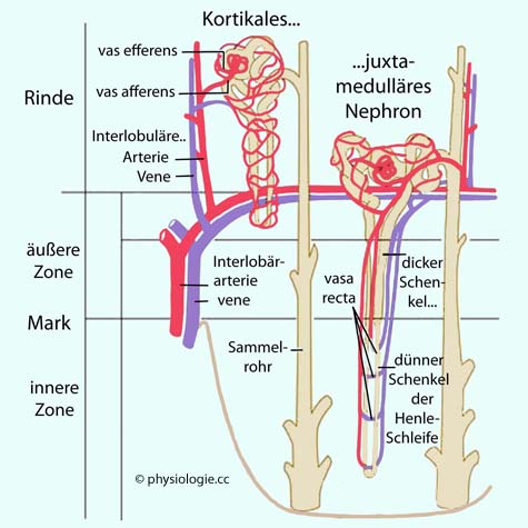 Die zahlreicheren kortikalen Nephrone liegen unter der Nierenoberfläche, ihre kurzen Henle-Schleifen liegen im Wesentlichen in der Rindenzone; ihre Kapazität für die Rückresorptionvon Wasser und Elektrolyten ist relativ gering.