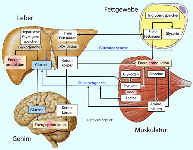Glucose auf. Lipolyse (Fettgewebe) und Glukoneogenese (Leber) sind