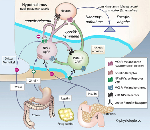 fördert die Insulinsensitivität. Das Gehirn überprüft die Verfügbarkeit von Nährstoffen und reagiert auf hormonelle Signale aus der Peripherie Der laterale Hypothalamus regt die Nahrungsaufnahme an ("Hungerzentrum": Läsionen führen zu Appetitverlust und Anorexie), der ventromediale drosselt die Nahrungsaufnahme ("Sattheitszentrum": Läsionen führen zu Gewichtszunahme). α-MSH / CART-Neurone hemmen das Hungerzentrum, regen sympathische
