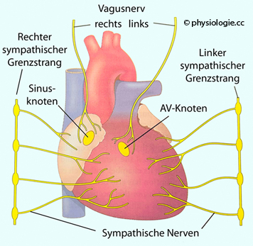 Reizleitungssystem (rechter Vagus: Sinusknoten, linker: AV-Knoten) und