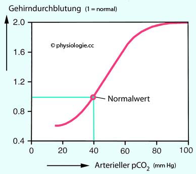 Zwischen ~50 und ~150 mmHg arteriellem Druck wird die zerebrale Perfusion (~15% des Ruhe-HZV) myogen autoreguliert (~55 ml/min/100g), steigt aber mit steigendem pCO2 (normal ~40 mmHg; Hypokapnie