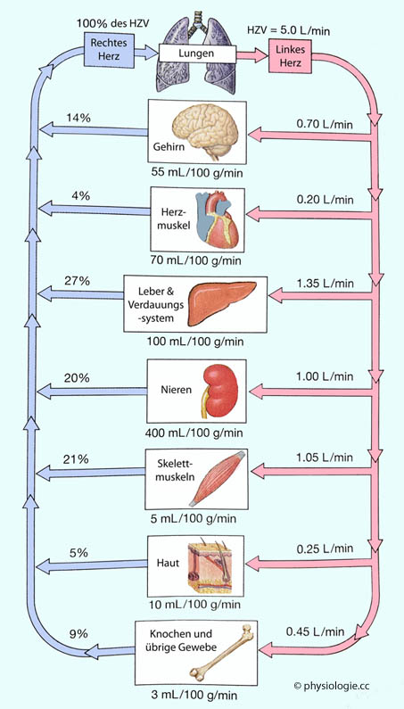 ~5% für andere Gewebe (dieser Anteil kann stark steigen, z.B. nimmt die Haut bei extremer Wärmebelastung bis zur Hälfte des - dann erhöhten - Herzminutenvolumens in Anspruch).