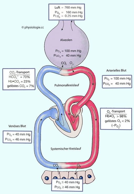 Der Sauerstoffbedarf der Körpers beträgt durchschnittlich ≥4 ml/kg/min (bei 70 kg KG ~0,3 l/min). Arterielles Blut ist so gut wie vollständig O2-gesättigt und transportiert bei
