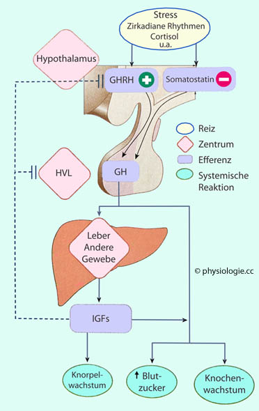 nimmt er durch die insulinantagonistische Wirkung des GH zu (diabetogener Effekt). Bei Stress und Hunger ist der GH-Spiegel erhöht, IGF-Effekte werden überspielt, Energieträger mobilisiert - der Blutzuckerspiegel