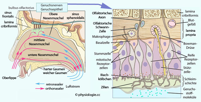 Die ~20 Millionen Geruchssinneszellen (Lebensdauer ~4 Wochen) haben