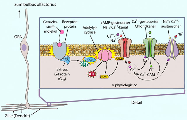 Nasenschleim gelöste Duftstoffe detektieren - unterstützt durch odorant-binding proteins, welche die Löslichkeit hydrophober Stoffe erhöhen. Jede olfaktorische Sinneszelle exprimiert jeweils nur einen Rezeptortyp G-Protein-gekoppelte Rezeptoren wirken über Adenylylcyclase, cAMP öffnet einen nichtselektiven Kationenkanal (CNG: Cyclic