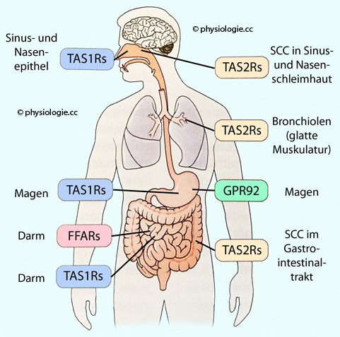 Abbildung gezeigten Geschmacksrezeptoren:| Extraorale Geschmacksrezeptoren Vorkommen, Bindungspartner, Effekte (Auswahl) Nach Augustine / Groh / Huettel / LaMantia / White (eds), Neuroscience. Intl 7th ed. Oxford University Press 2024 |