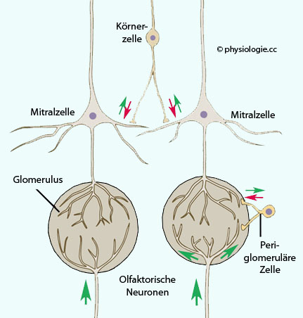 Mitral- oder Büschelzelle, und diese in den tractus olfactorius. Periglomeruläre und Körnerzellen werden von