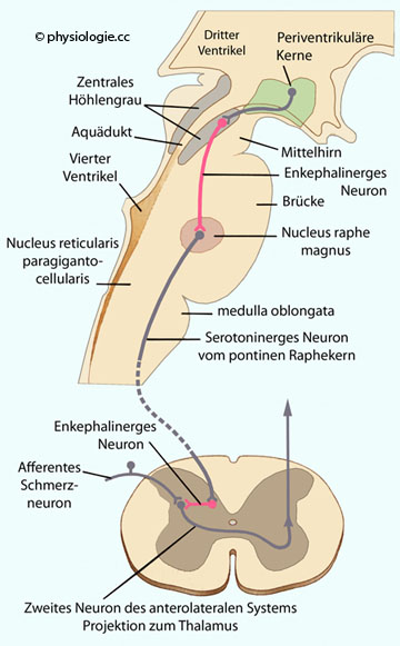 Schmerzmodifikation. Raphekerne projizieren serotoninerg, der locus