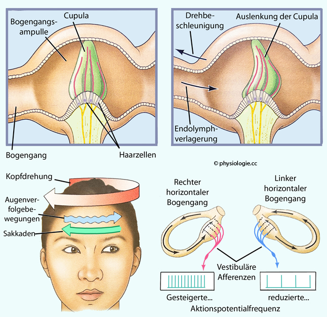 Abbildung unten). Bei Körperdrehungen werden Haarzellen in sämtlichen Bogengängen aus ihrer Ruhelage abgelenkt