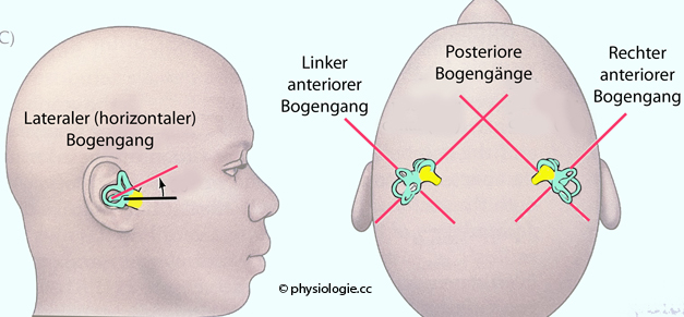 Aufgrund der Achsenlagen der Bogengänge (die gegen die anatomischen Achsen gewinkelt sind) werden bei Kopfdrehungen meist alle 6 Cupulae (links