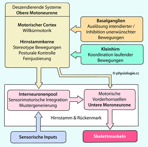 Die "oberen Motoneurone" in Großhirnrinde und Hirnstammkernen (deszendierende Systeme) stehen unter dem Einfluss von Kleinhirn und Basalganglien und projizieren vor allem auf den Interneuronenpool, eine kleinere Zahl von Neuronen direkt auf motorische Vorderhornzellen.