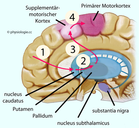 motorischen Cortex ein mehrgliedriger Mechanismus aus Basalganglien und motorischem Thalamus vorgeschaltet.