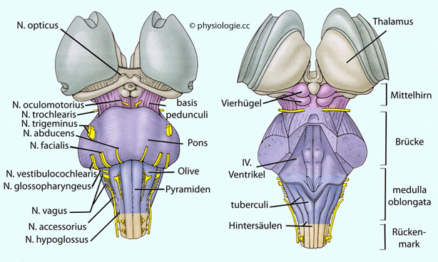 Links: Dorsalansicht des Hirnstamms (Kleinhirn entfernt).