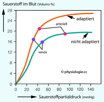 In den Lungenalveolen ergibt sich aufgrund der Mischung im Totraum ein pO2 von ~13 kPa (~100 mmHg). Bei diesem Partialdruck ist das Hämoglobin praktisch zur Gänze mit Sauerstoff gesättigt (Bindungskurve des Hämoglobins). Mit abnehmendem pO2 sinkt auch die Sauerstoffsättigung - entsprechend der Bindungskurve (z.B. 50% bei ~3,5 kPa pO2).